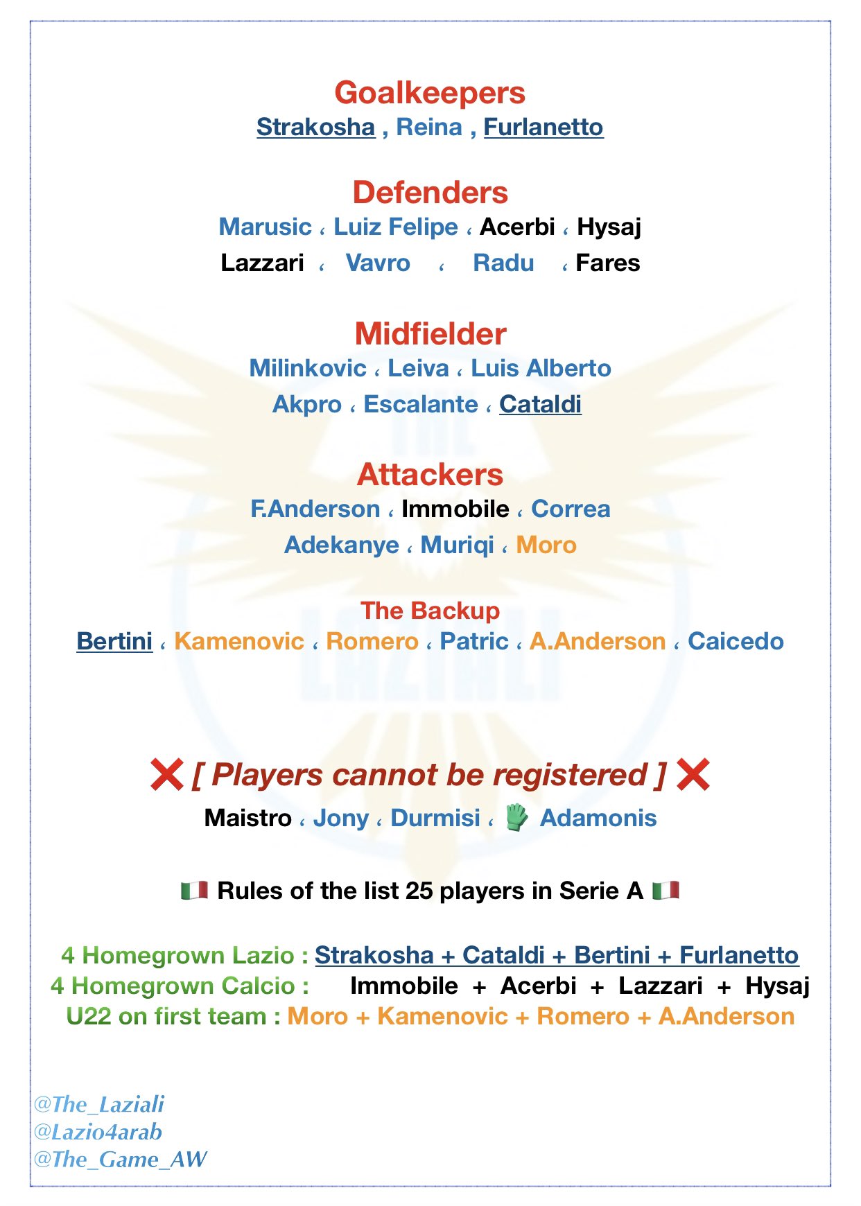 - A minimum of 4 Club-Trained Players (Homegrown Lazio)