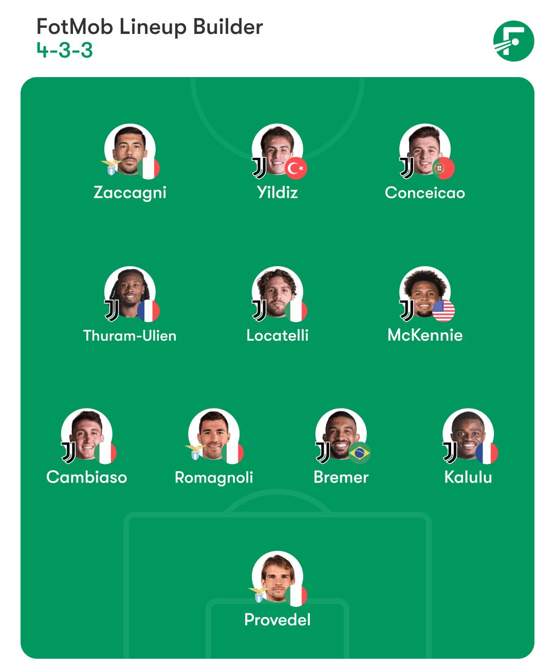 Juventus and Lazio have both been lacking a consistent goal threat upfront, even though Jonathan David has been showing improving signs. With nine strikes to his name, Kenan Yildiz is the leading goal-scorer among the two clubs, which justifies his selection as a centre-forward
